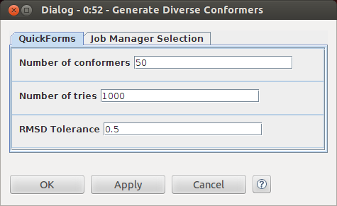 Conformer generation is done using the RDKit distance geometry implementation. The resulting conformers are cleaned up with the MMFF94 force field and then an RMS filtering step is applied to remove redundant conformers. The meat of the workflow is mostly hidden in the metanodes, so I set up some quickforms to make configuration easy. Here's the configure dialog for the "Generate Diverse Conformers" metanode: